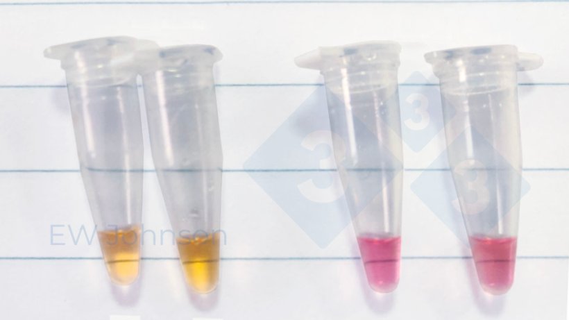 Rysunek 3 przedstawia wynik testu LAMP dla afrykańskiego pomoru świń (ASF) - probówka A zawierała ekstrakt ze śledziony lochy, która padła na ASF. Wysoka zawartość DNA wirusa generuje nieprzezroczysty żółty kolor. Probówka B była wymazem z jamy ustnej z typowym niższym obciążeniem wirusem ASF od tej samej lochy. Zmętnienie w probówkach A i B jest widoczne poprzez zaciemnienie linii tła. Probówki od C do F są wątpliwe i ujemne.