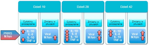 Oba patogeny PRRSV i M.hyo mają duży wpływ na produkcję cytokin zapalnych, które mogą sprzyjać indukcji choroby i utrzymywaniu się tych mikroorganizmów w organizmie gospodarza.