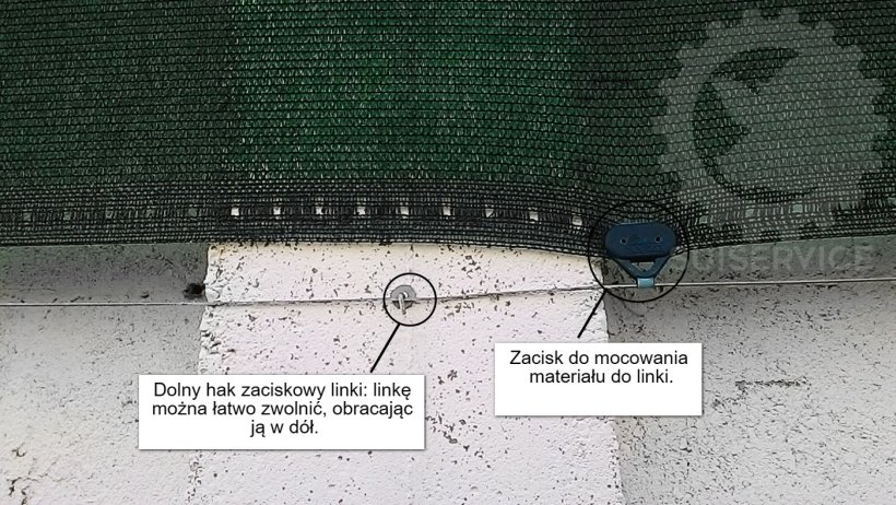 Dwie równoległe plecione linki stalowe są zamocowane nad i pod oknami na całej długości budynku, wyposażone na końcach w napinacz, aby utrzymać naprężenie tkaniny.