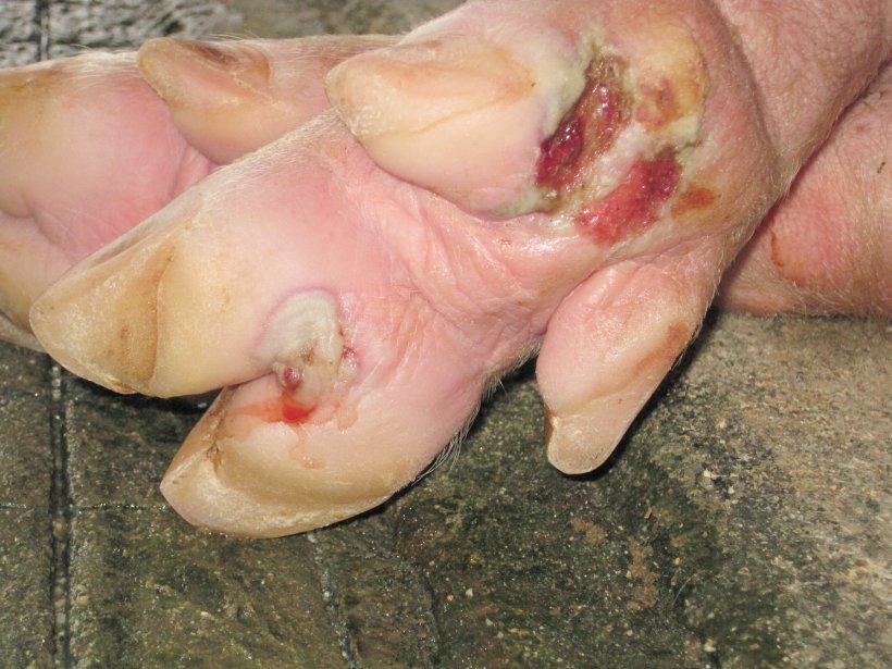 W tuczarniach hodowca zaobserwał posmutnienie i kulawizny zwierząt. Problem kulawizny o różnym nasileniu dotyczył niemal wszystkich zwierząt, które w większości leżały. Zmuszone do wstania, głośno kwiczały i utykały. Świnie nie mogły podchodzić do karmideł w związku z czym zpożycie paszy było małe a kondycja świń ulegała pogorszeniu. Niektóre zwierzęta się śliniły a na palcach obserwowano krwawe wrzodziejące zmiany. Były one głównie zlokalizowane na bokach palców powyżej racic a niekiedy między palcami. U niektórych zwierząt przewlekłe zmiany ulegały gojeniu.
