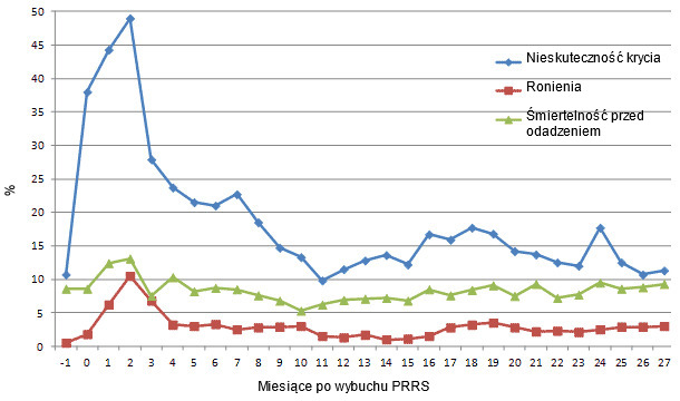 Po zamknięciu stada podstawowego współczynnik ronień i śmiertelność przed odsadzeniem pozostawały na podwyższonych poziomach przez około 4 miesiące. Najwyższy poziom strat związanych z zaburzeniami w rozrodzie zaobserwowano 2 miesiące po wybuchu PRRS, kiedy współczynnik ronień sięgnął 10,5% (Ryc. 1a). Skuteczność krycia spadła z 90% w miesiącu poprzedzającym wybuch PRRS do 50% w 3 miesiące później. Cztery miesiące po wybuchu choroby współczynnik ronień powrócił d zadowalającego poziomu 3,2% lecz skuteczność krycia była stale niska. Osiem miesięcy po wybuchu skuteczność krycia sięgnęła 81,5% i pozostawała powyżej tego poziomu w kolejnych miesiącach. Najwyższy odsetek martwo urodzonych prosiąt (8,2%) zarejestrowano 2 miesiące po wybuchu PRRS a parametr ten pozostawał podwyższony do 7 miesiąca po wybuchu. Również poziom śmiertelności przed odsadzeniem wzrósł do 14,1% w 2 miesiące po wybuchu i powrócił do stanu sprzed wybuchu po kolejnych 3 miesiącach (Ryc. 1a).
