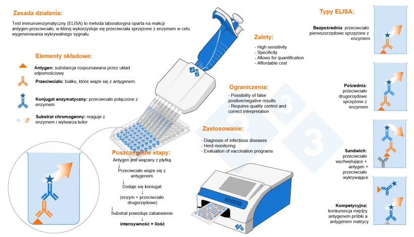 Niniejsza infografika zawiera obiektywny przegląd mechanizmów działania, elementów strukturalnych i głównych wariantów tego testu immunologicznego opartego na wiązaniu antygen-przeciwciało.