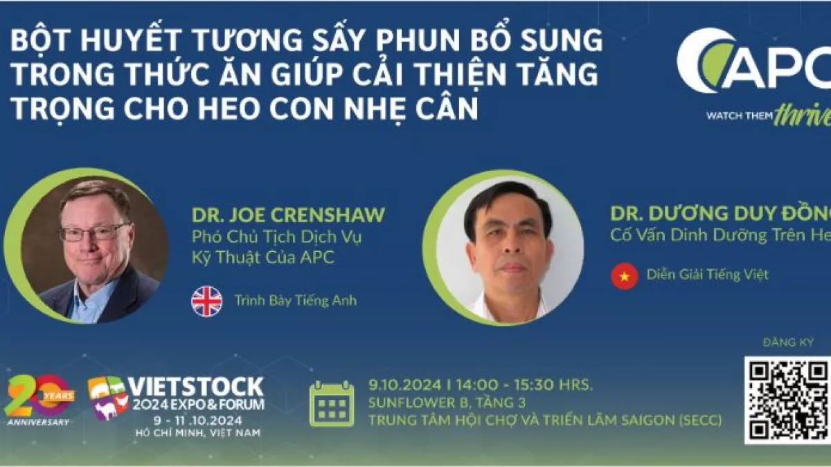 Địa điểm: Phòng Sunflower B, Tầng 3, Trung tâm hội chợ và triển lãm Saigon(SECC)Học hỏi từ các chuyên gia dinh dưỡng trên heo về các chiến lược dinh dưỡng vượt trội để tăng thành tích trên heo con nhẹ cân. Đừng bỏ lỡ cơ hội để thu thập được những hiểu biết giá trị từ Tiến sĩ Joe Crenshaw - Phó chủ tịch Dịch vụ kỹ thuật của APC và Tiến sĩ Dương Duy Đồng - Chuyên gia dinh dưỡng trên heo từ Đại học Nông lâm Tp. Hồ Chí Minh!
