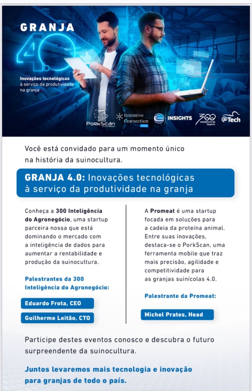 Esse programa, realizado em parceria com a PwC e promovido no hub de inovação AgTech Garage, teve como objetivo identificar e impulsionar tecnologias voltadas para a Granja 4.0. Entre mais de 20 soluções inscritas, destacaram-se pelo seu potencial transformador, a startup 300 Inteligência do Agronegócio e a Promeat, que foram criteriosamente selecionadas dentro do programa Intensive Connection 2024.