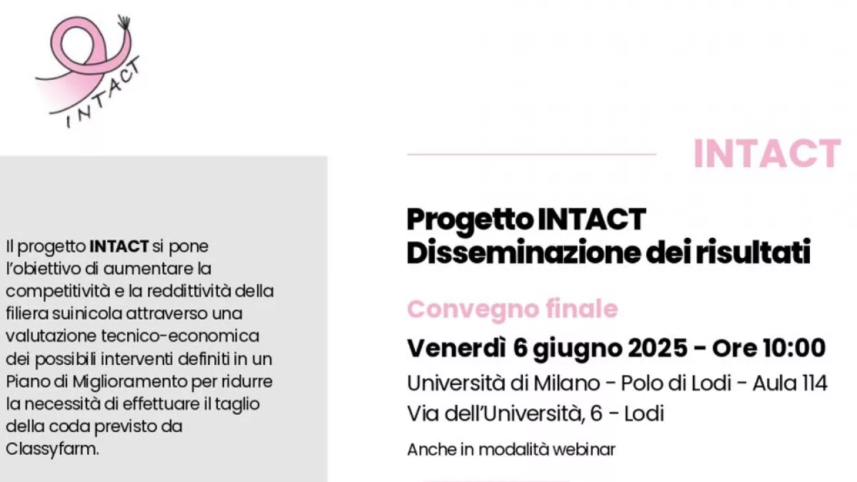 Il progetto INTACT si pone l’obiettivo di aumentare la competitività e la reddittività della filiera suinicola attraverso una valutazione tecnico-economica dei possibili interventi definiti in un Piano di Miglioramento per ridurre la necessità di effettuare il taglio della coda previsto da Classyfarm.