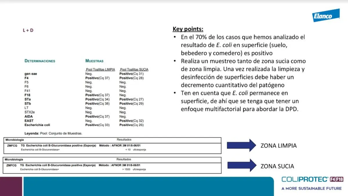 O que fazemos em nossa auditoria? Procure Eshcerichia coli nas superfícies (comedouros, bebedouros e piso) antes e depois da limpeza e desinfeção dos ambientes. O objetivo é revisar a redução de sua presença através de UFC/esponja ou com PCR quantitativo.