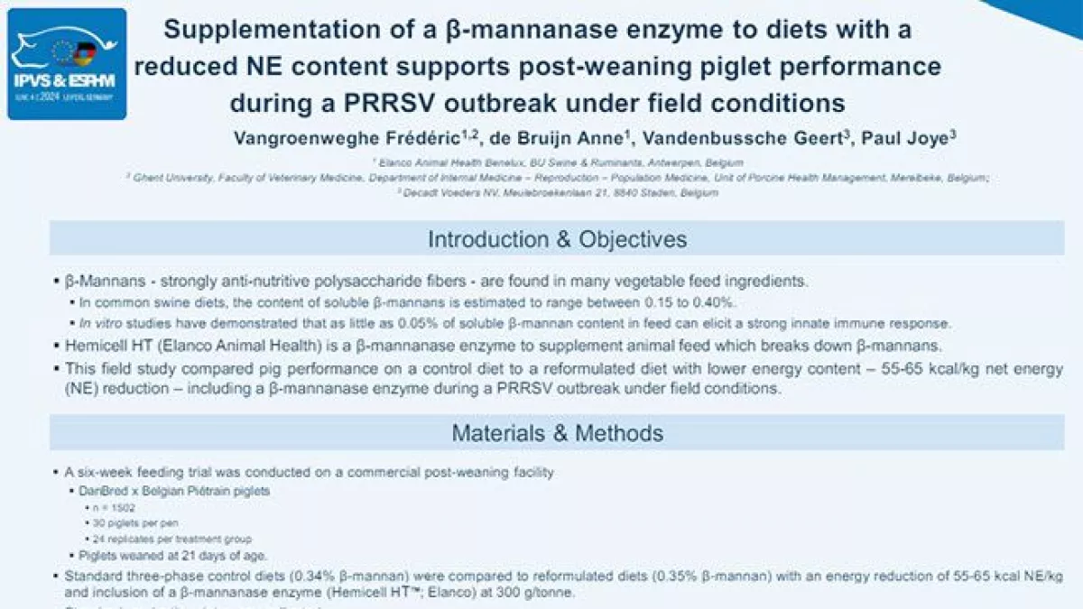 El presente ensayo demostró que la inclusión de Hemicell HT (encima ß - mananasa para complementar la alimentación animal que descompone los ß - mananos) en dietas reformuladas con un menor contenido energético (55-65 kcal NE/kg de pienso) era capaz de matener el rendimiento productivo en lechones posdetetados, que padecían una circulación activa de PRRRSV y una meningitis secundaria por S. suis, con un beneficio económico.