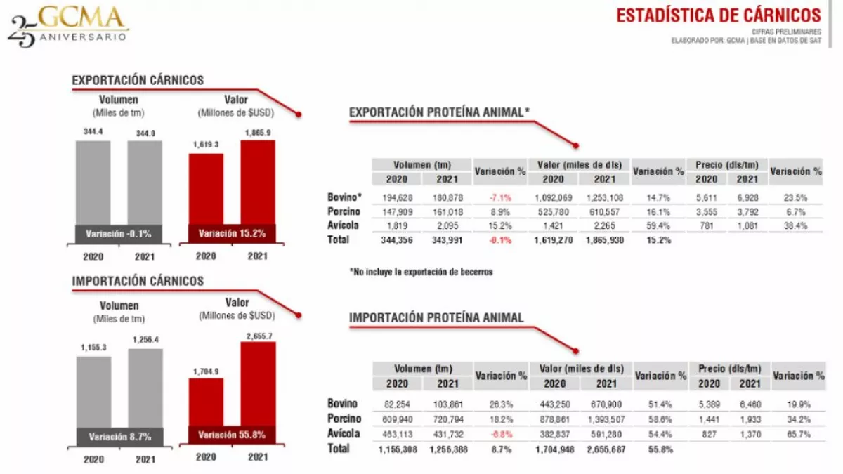 (Bovino, Porcino, Avícola).En las exportaciones, el volumen exportado se mantiene similar al 2020, pero incrementa el valor en 15.2%.