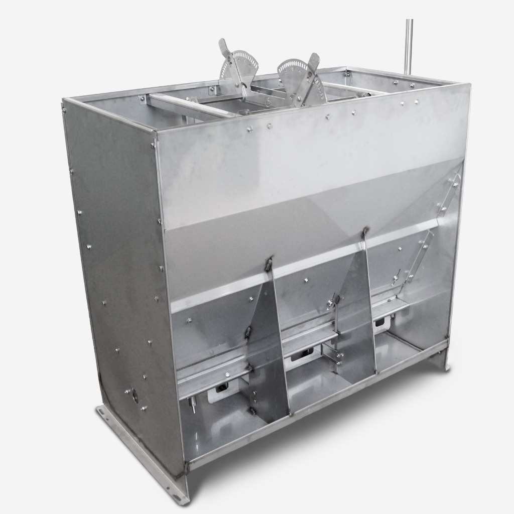 Su configuración y medidas asegura que los lechones tengan un fácil acceso de forma ordenada, incluso los más pequeños. Esta tolva dispone de 6 amplias bocas de alimentación, (3 por cada cara: frontal i posterior) para alimentar en dos corrales a la vez un total de 30 a 40 lechones. La cantidad de pienso a subministrar se regula fácilmente mediante la maneta de regulación de caudal que ofrece 25 posiciones posibles, de forma independiente en cada lado.