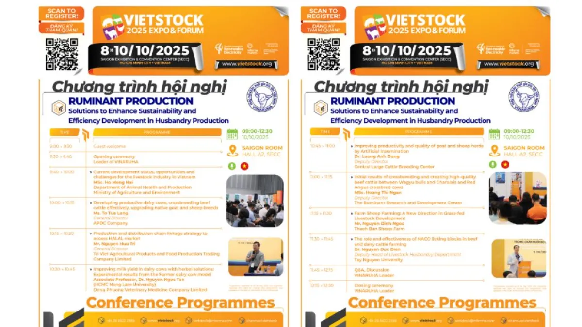 In collaboration with the Vietnam Ruminant Husbandry Association (VINARUHA) at 9 AM on October 10 at the Saigon Conference Room, Hall A2, Vietstock 2025 will present the Conference with the theme:“Solutions to Enhance Sustainable and Efficiency Development in Husbandry Production.”