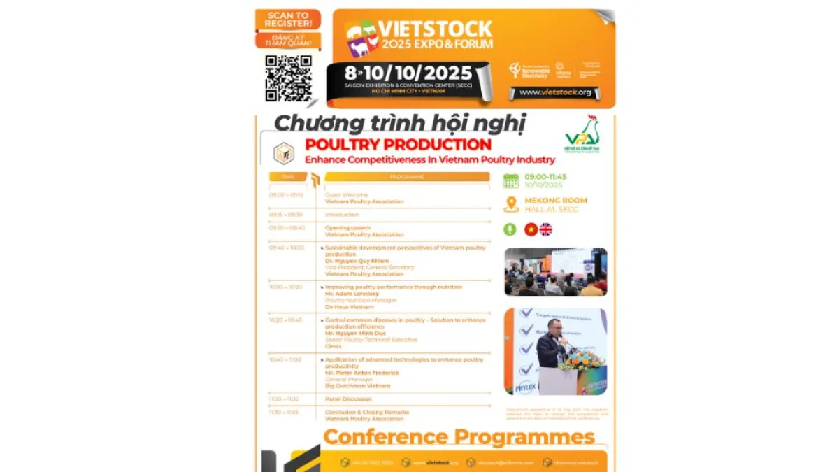 The Ministry of Agriculture and Environment will chair the Industry conference at Vietstock 2025 with the theme:“Livestock and Poultry Development to Ensure Supply Capacity for Last Quarter of 2025 and Early 2026.”