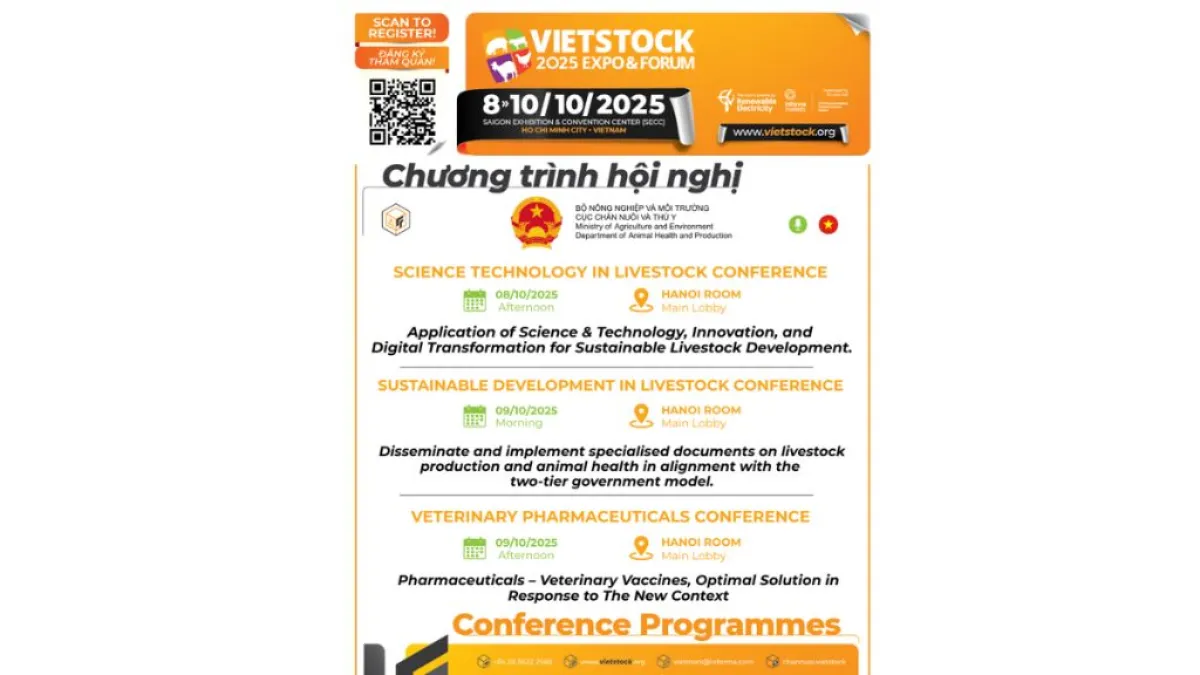 On October 08–09, within the framework of Vietstock 2025, the Department of Animal Health and Production (Ministry of Agriculture and Environment) will host 03 key conferences focusing on crucial topics: