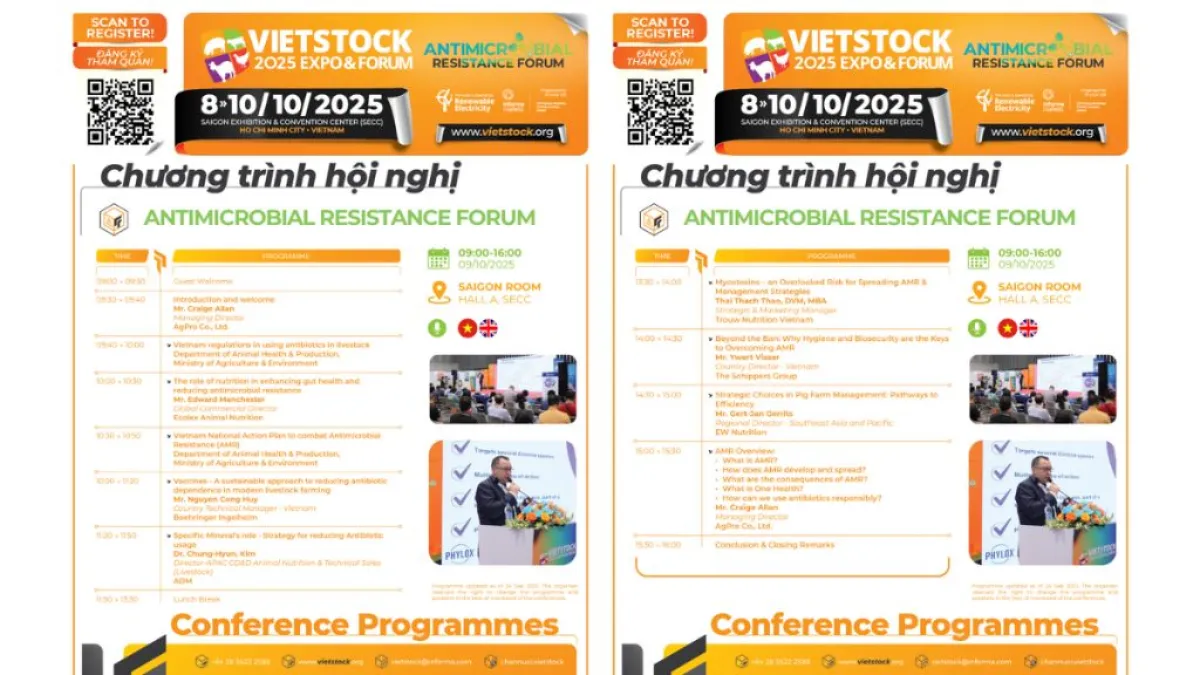 Antimicrobial Resistance Forum – First Time at Vietstock 2025Antimicrobial resistance (AMR) is becoming one of the biggest challenges for Vietnam’s livestock industry, driven by the misuse and overuse of antibiotics. To raise awareness and deliver practical solutions, Vietstock 2025 will host the Antimicrobial Resistance Forum for the first time, bringing together leading experts to share insights, discuss key issues, and explore actions for the future of the industry.