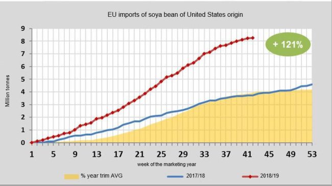 Przywóz soi amerykańskiej do Unii Europejskiej wzrósł o 121% w bieżącym roku rynkowym (od lipca 2018 r. do połowy kwietnia 2019 r.) w porównaniu z tym samym okresem w poprzednim roku.