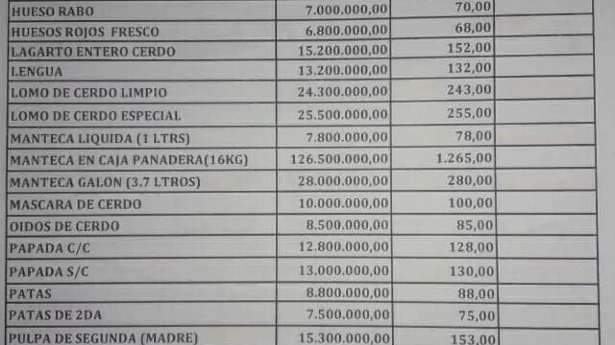 PRODUCTOS Y SUBPRODUCTOS CERDO PRECIOS CENTRO PAIS BS SOBERANOS