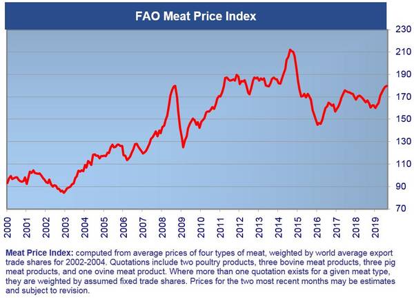 Indeks cen mięsa FAO wynosił w sierpniu średnio 179,8 punktu, co stanowi wzrost o 0,5 procent (prawie 1 punkt) w stosunku do zrewidowanej wartości z lipca, kontynuując trend umiarkowanych wzrostów cen w ujęciu miesięcznym od lutego. Przy ostatnim wzroście wartość wskaźnika wynosi 12,3 procent powyżej poziomu z stycznia 2019 r. i 7,8 procent powyżej analogicznego miesiąca ubiegłego roku. W sierpniu notowania cen wieprzowiny uległy dalszemu wzmocnieniu, poparte silnym popytem importowym z Azji, głównie Chin, gdzie afrykański pomór świń (ASF) nadal ogranicza krajową produkcję wieprzowiny. Pomimo silnego popytu na import notowania cen drobiu i owiec pozostały stabilne, odzwierciedlając zwiększoną dostępność eksportową z głównych regionów produkujących. Podczas gdy międzynarodowy handel wołowiną pozostawał silny, jego notowania cenowe w USD nieznacznie spadły, odzwierciedlając osłabienie walut krajowych niektórych dużych krajów eksportujących, w tym Australii.