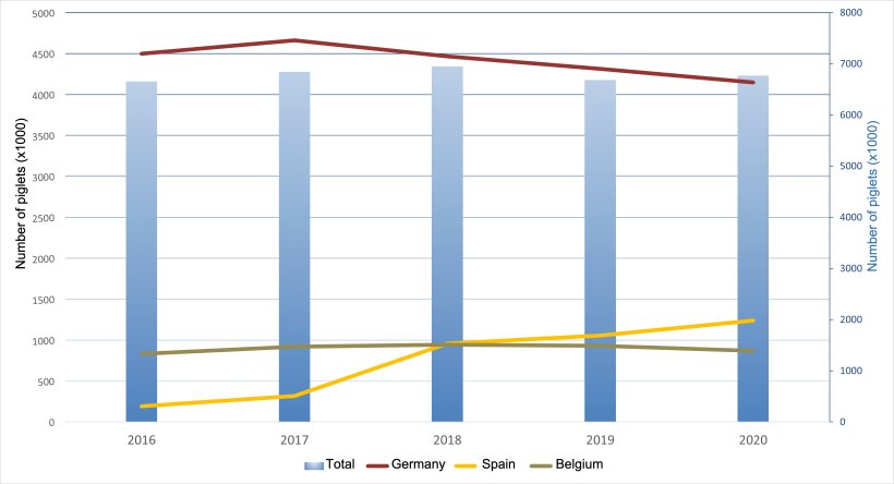 Hiszpania wyróżnia się postępującym wzrostem importu holenderskich prosiąt, który w ubiegłym roku wzrósł o 17% w stosunku do 2019.