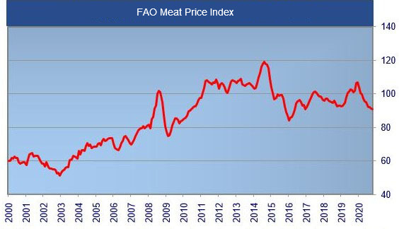 Wskaźnik cen mięsa FAO wynosił średnio 90,7 punktu w październiku, nieznacznie niższy (0,5 punktu lub 0,5 procent) od września, co oznacza dziewiąty miesięczny spadek od stycznia; wyniósł 10,9 punktu (10,7 procent) mniej niż rok temu.