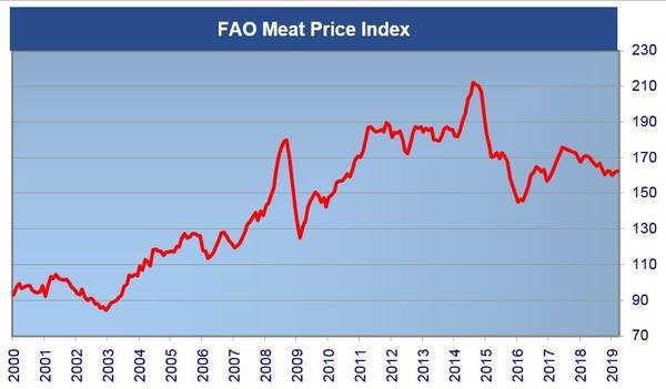 Indeks cen mięsa FAO wynosił średnio 162,5 punktu w marcu, nieznacznie więcej (0,6 punktu lub 0,4 procent) w porównaniu ze zrewidowaną wartością za luty, kontynuując trend umiarkowanej zmienności cen obserwowany od kilku miesięcy.