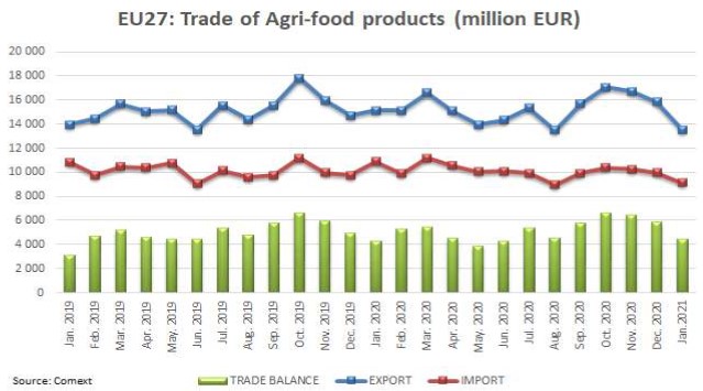 W styczniu 2021 r. eksport produktów rolno-spożywczych z UE zmniejszył się o 11% w porównaniu ze styczniem 2020 r., osiągając łączną wartość 13,5 mld EUR. Import osiągnął wartość 9,1 mld euro, o 16% mniej niż w styczniu 2020 r. Spadek ten następuje po dłuższym okresie ciągłego wzrostu eksportu. Doprowadziło to do nadwyżki w handlu produktami rolno-spożywczymi w styczniu 2021 r. wynoszącej 4,4 mld EUR, co stanowi wzrost o 3,6% w porównaniu ze styczniem 2020 r.