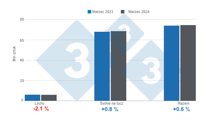 • Na dzień 1 marca 2024 r. w amerykańskich gospodarstwach rolnych było 74,6 mln świń, co stanowi wzrost o 1% w porównaniu z marcem 2023 r., ale spadek o 2% w porównaniu z 1 grudnia 2023 r.